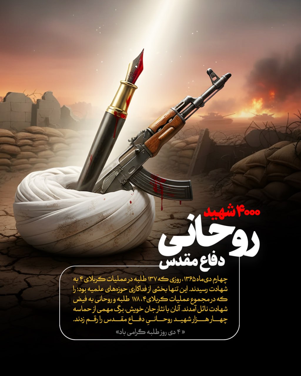 🔸 این تنها بخشی از فداکاری حوزههای علمیه بود؛ چرا که در مجموع عملیات کربلای ۴، ۱۷۸ طلبه و روحانی به فیض شهادت نائل آمدند.