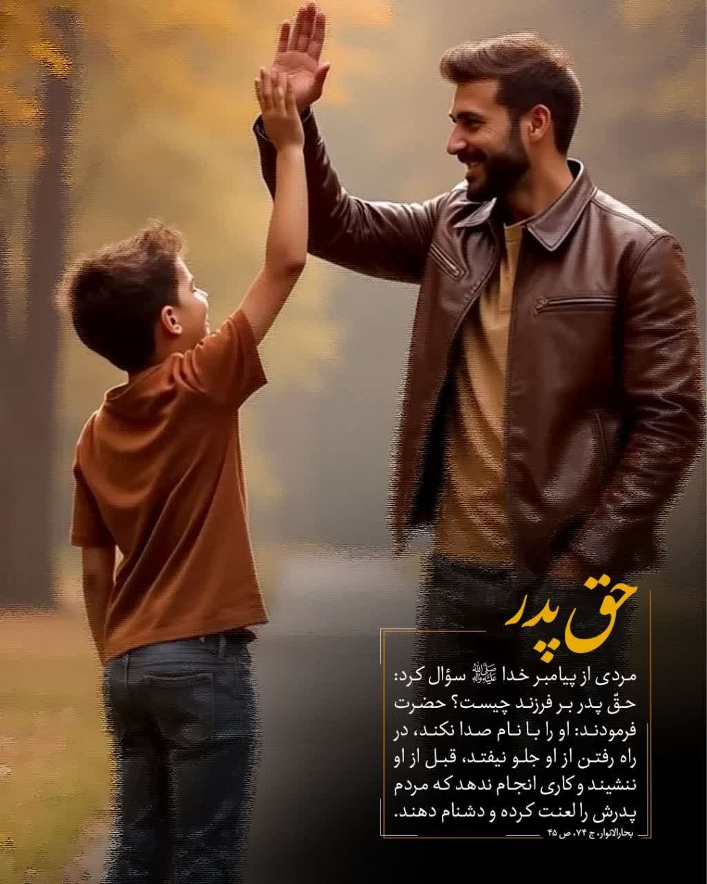 امام رضا علیه السّلام فرمودند: مردی از پیامبر خدا صلّی الله علیه و آله سؤال کرد: حقّ پدر بر فرزند چیست؟ حضرت فرمودند: او را با نام صدا نکند، در راه رفتن از او جلو نیفتد، قبل از او ننشیند و کاری انجام ندهد که مردم پدرش را لعنت کرده و دشنام دهند.