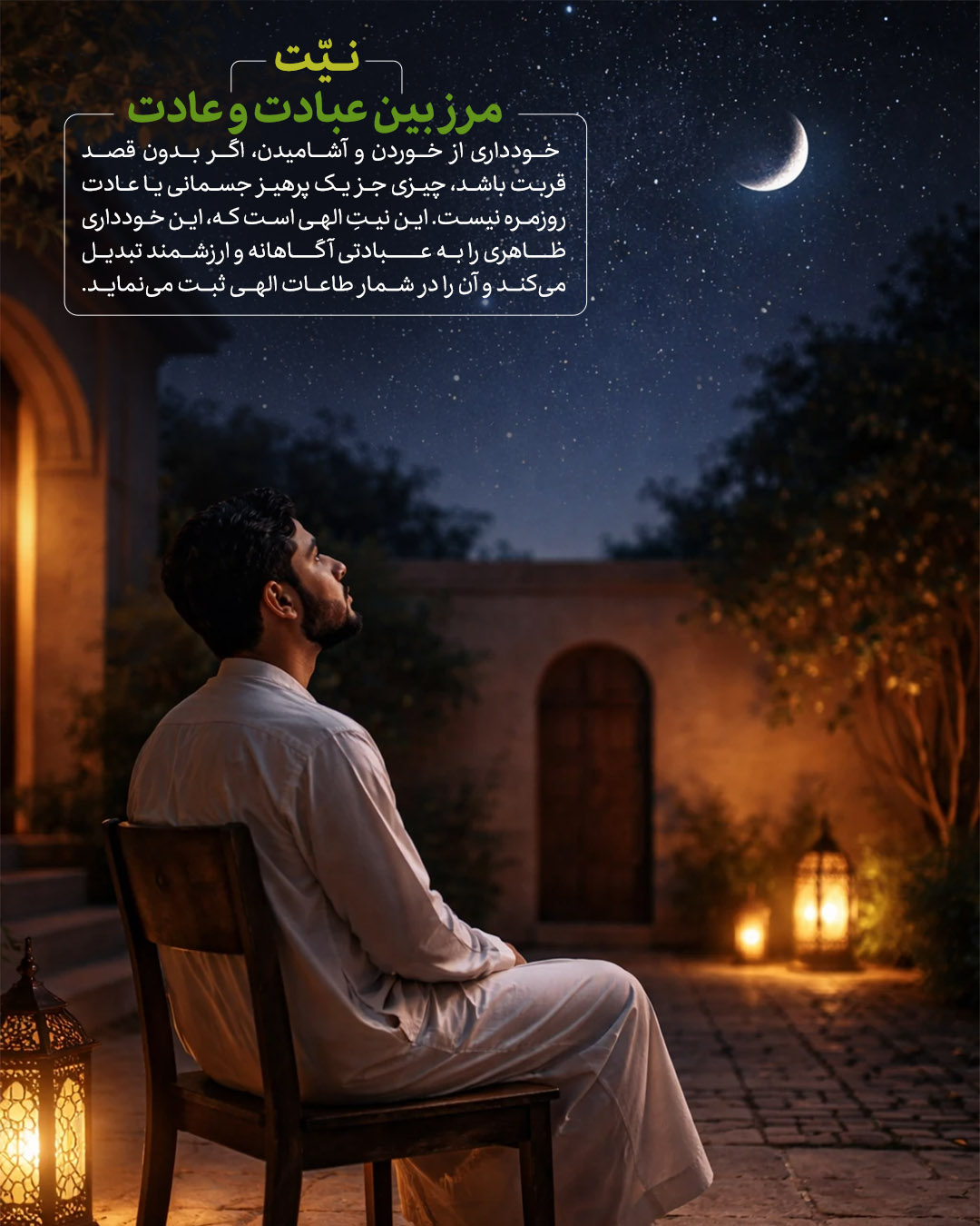 خودداری از خوردن و آشامیدن،اگر بدون قصد قربت باشد،چیزی جز یک پرهیز جسمانی یا عادت روزمره نیست.نیتِ الهی است که، این خودداری ظاهری رابه عبادتی آگاهانه و ارزشمند تبدیل میکندو آن را در شمار طاعات الهی ثبت مینماید.
